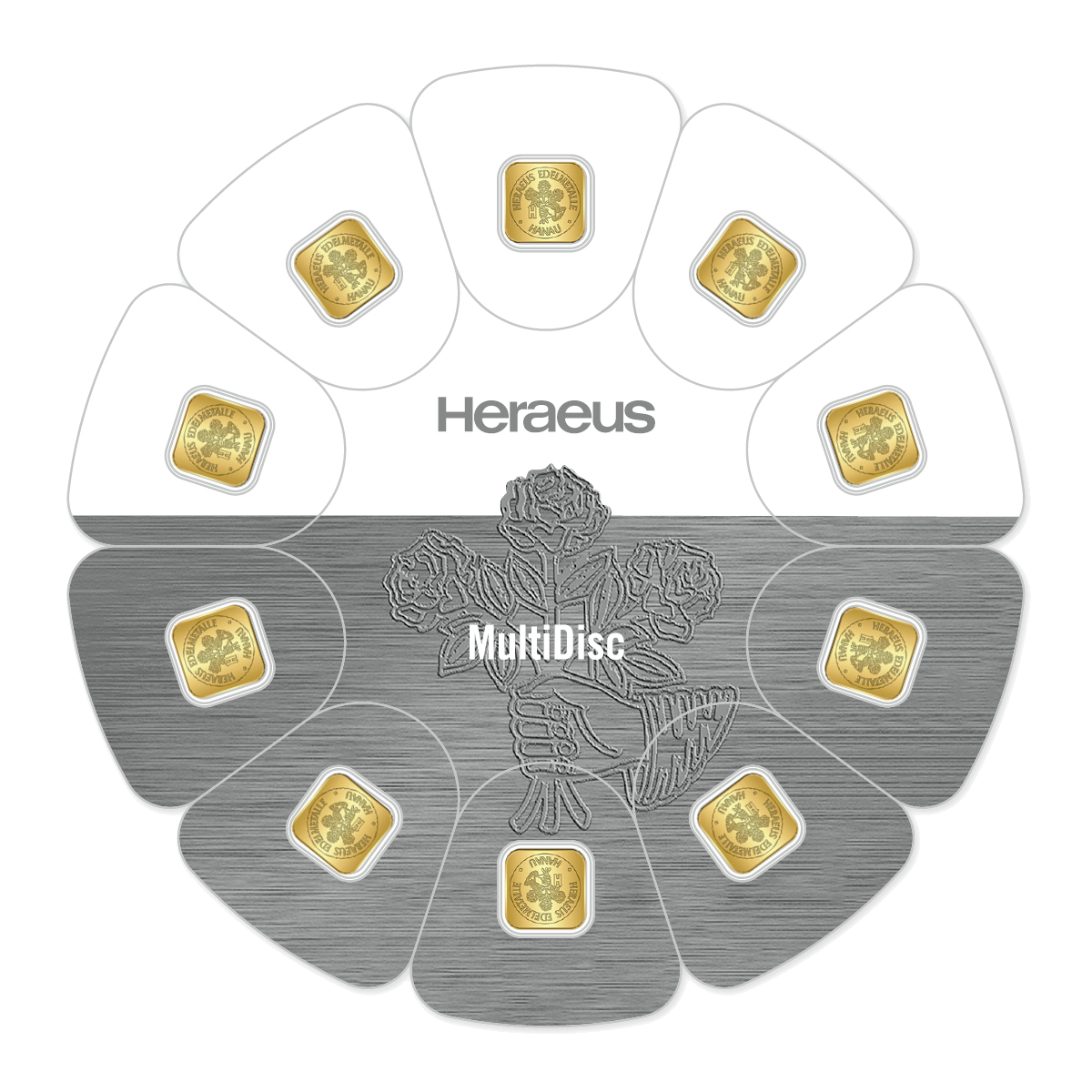 La nouvelle génération de disques Heraeus MultiDisc permet de réduire les coûts de production et d'améliorer la qualité des produits. MultiDisc zawiera 10 wytłaczanych sztabek złota o masie 1 g w unikalnym, kwadratowym formacie, dostępnym wyłącznie w tym produkcie.