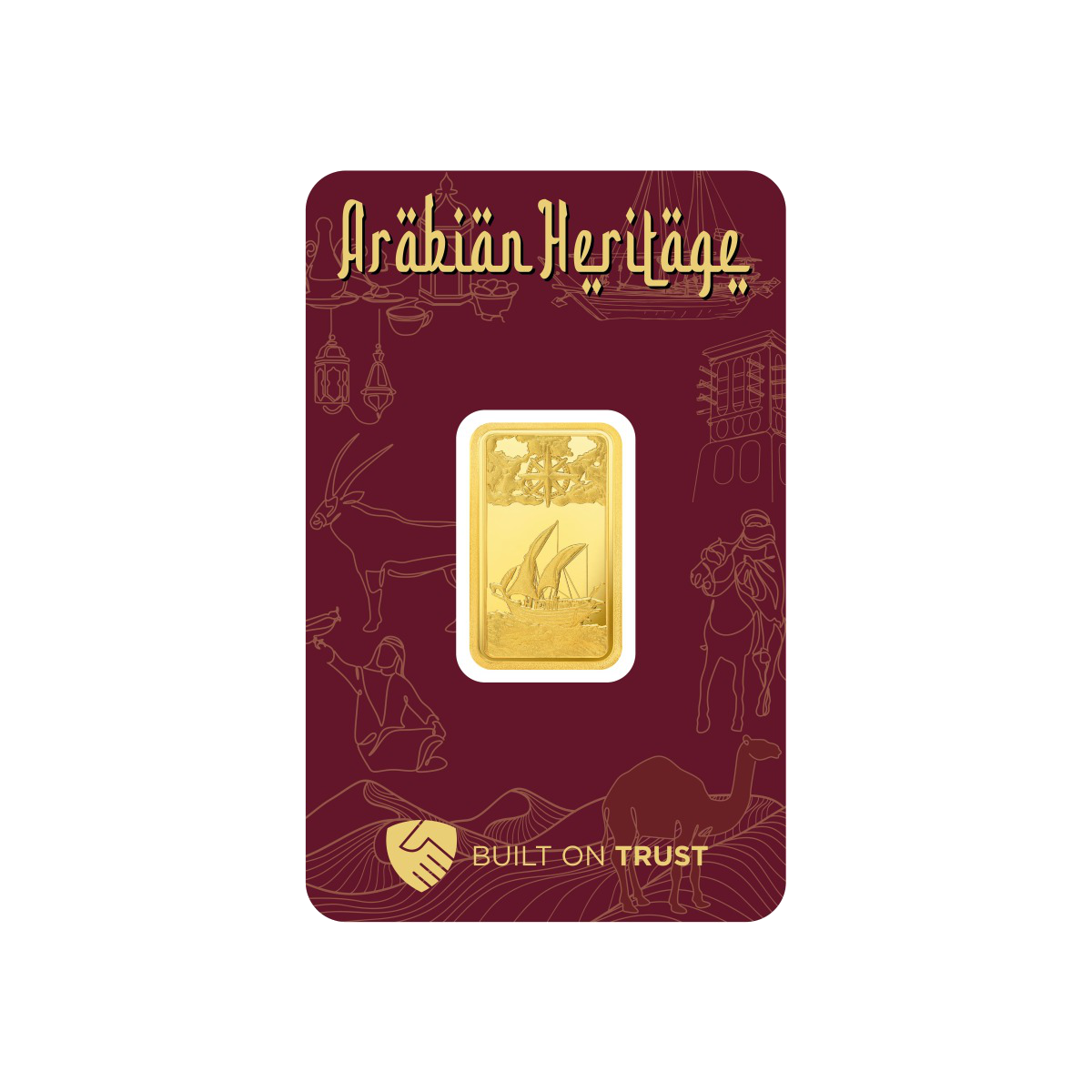 Wspaniały dau, tradycyjny drewniany żaglowiec, został przedstawiony pod pełnymi żaglami na tej złotej sztabce. Misterny grawerunek uchwycił szczegóły jego drewnianych desek, żagli i olinowania, ukazując jego elegancję oraz znaczenie w morskiej historii regionu.